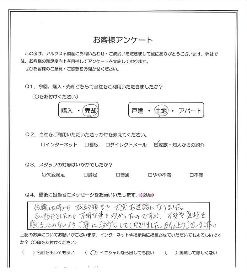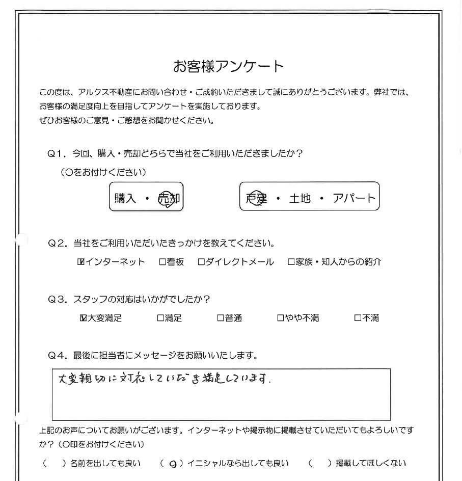 依頼した時から成約後まで大変お世話になりました。古い物件でしたので不明な事も多かったのですが、不安や負担を感じることのないよう丁寧にご対応してくださりました。
